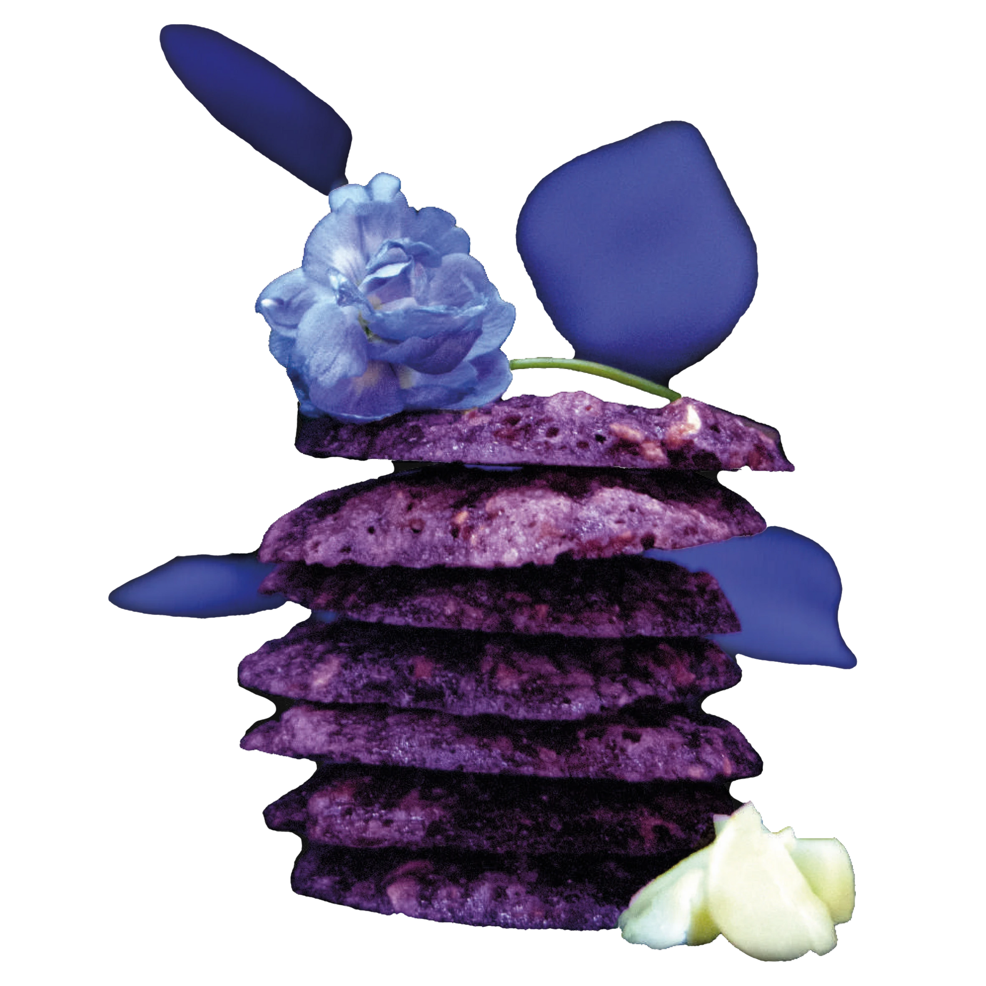 Sucre glace (France), amandes hachées, farine de blé, blancs d’œufs, arôme naturel de violette, concentré de carotte et de myrtille, amidon de pomme de terre, poudre levante (disphosphate disodique, carbonate acide de sodium).